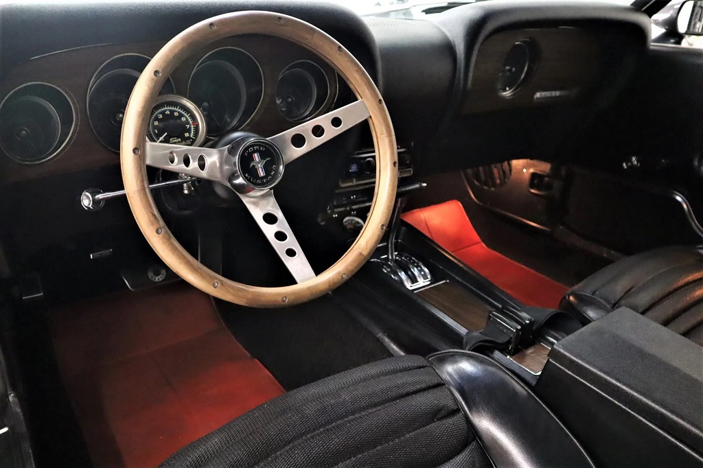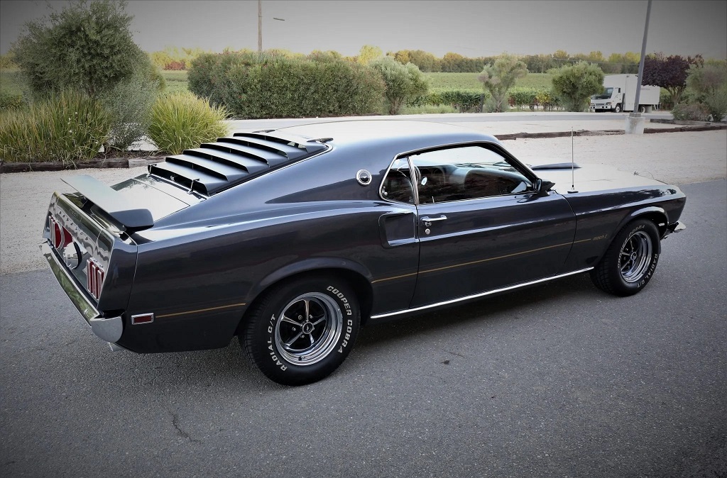 The 1969 Ford Mustang Mach 1 featured in this description is a stunning classic car. It boasts a dark gray metallic exterior complemented by black vinyl accents. Under the hood, you'll find a powerful 351 Windsor V8 engine paired with a three-speed automatic transmission, delivering an exhilarating driving experience. Inside the cabin, you'll find black vinyl upholstery, creating a sleek and timeless aesthetic. The car is also equipped with SportSlats rear window louvers, further enhancing its aggressive appearance. An Alpine stereo system allows for an enjoyable driving experience, offering high-quality sound.